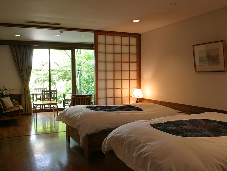 木々に囲まれた緑豊かな自然と、きめ細やかなサービスの両面から、安心を感じていただける空間作りを目指しています。全室にエアウィーヴの寝具が採用され、夢の中でも心を込めたおもてなしをしています。